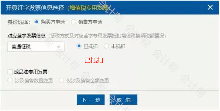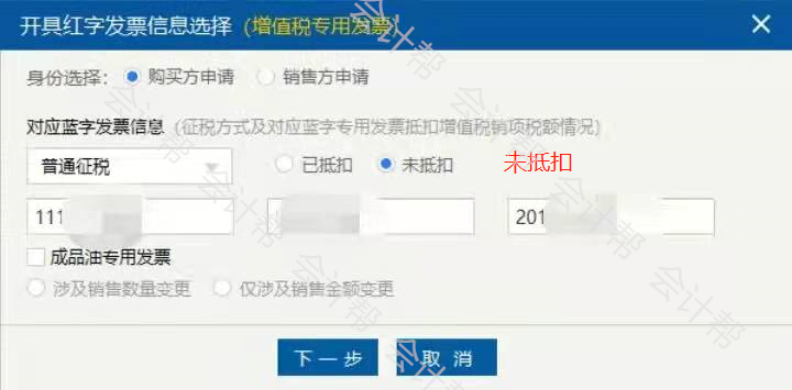 当选择已抵扣时,只要选择发票种类后,不需要填写对应蓝字发票代码和发票号码,点“下一步”进入填开界面;选择未抵扣时,应根据实际情况勾选原蓝字发票的征税方式,填写对应蓝字发票代码和发票号码。
